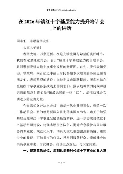 / 【七哥公文】2026年:在2026年镇红十字基层能力提升培训会上的讲话+更多免费公文+VX:QiGeGongWen2024
