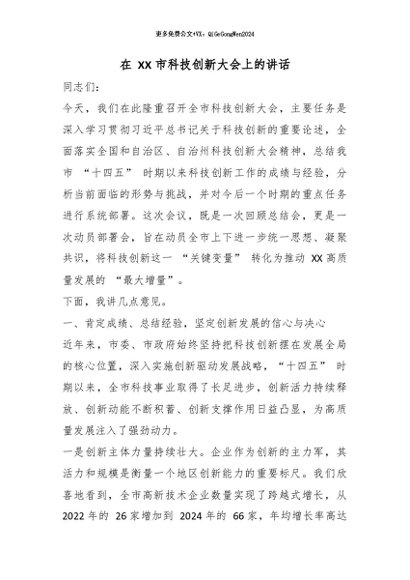 / 【七哥公文】2026年:在 XX 市科技创新大会上的讲话_副本+更多免费公文+VX:QiGeGongWen2024