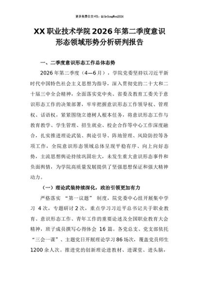 【七哥公文】2026年:XX职业技术学院2026年第二季度意识形态领域形势分析研判报告+更多免费公文+VX:QiGeGongWen2024