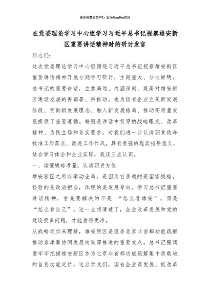 【七哥公文】2026年:在党委理论学习中心组学习总书记视察雄安新区重要讲话精神时的研讨发言_副本+更多免费公文+VX:QiGeGongWen2024