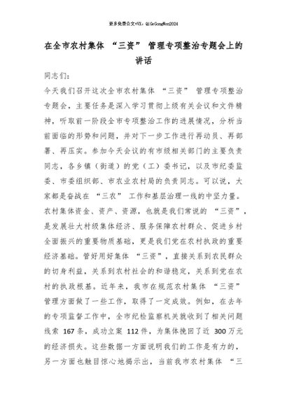 【七哥公文】2026年:在全市农村集体 “三资” 管理专项整治专题会上的讲话_副本+更多免费公文+VX:QiGeGongWen2024