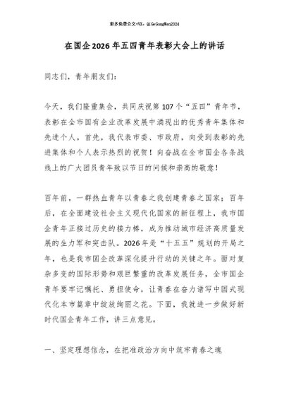 / 【七哥公文】2026年:在国企2026年五四青年表彰大会上的讲话_副本+更多免费公文+VX:QiGeGongWen2024