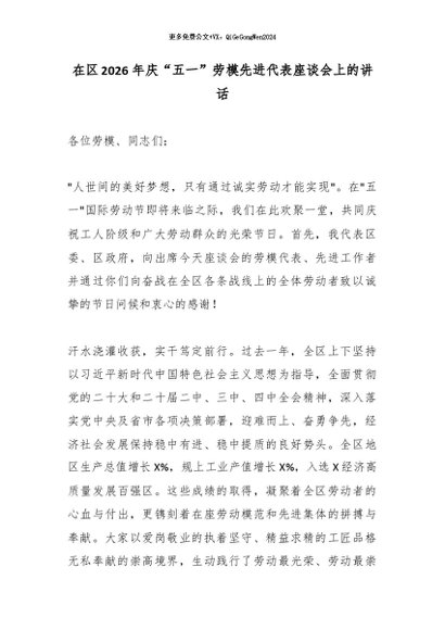 【七哥公文】2026年:在区2026年庆“五一”劳模先进代表座谈会上的讲话_副本+更多免费公文+VX:QiGeGongWen2024