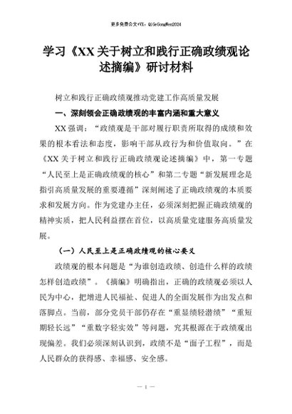 【七哥公文】2026年:学习《XX关于树立和践行正确政绩观论述摘编》研讨材料+更多免费公文+VX:QiGeGongWen2024