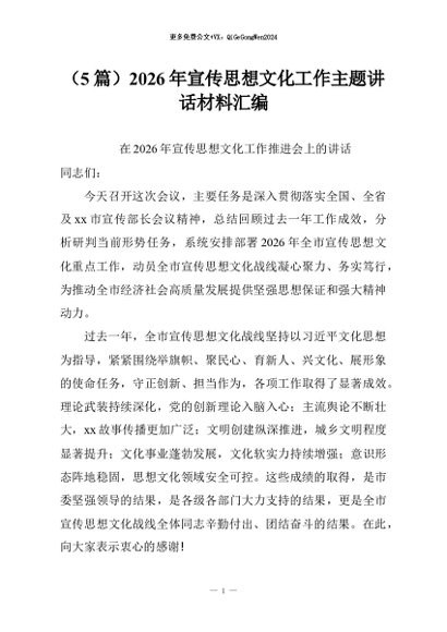 【七哥公文】2026年:(5篇)2026年宣传思想文化工作主题讲话材料汇编+更多免费公文+VX:QiGeGongWen2024