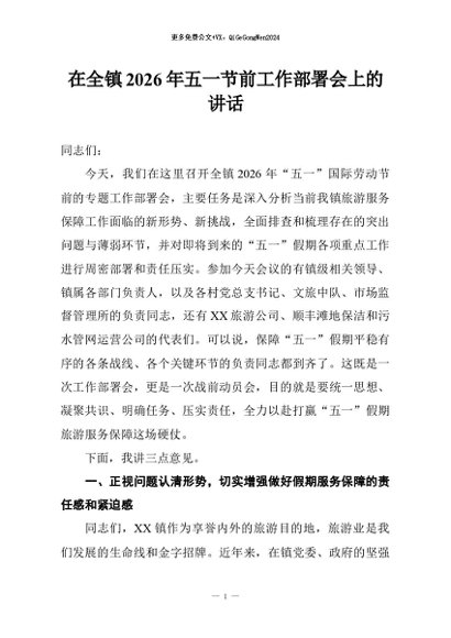 / 【七哥公文】2026年:在全镇2026年五一节前工作部署会上的讲话+更多免费公文+VX:QiGeGongWen2024