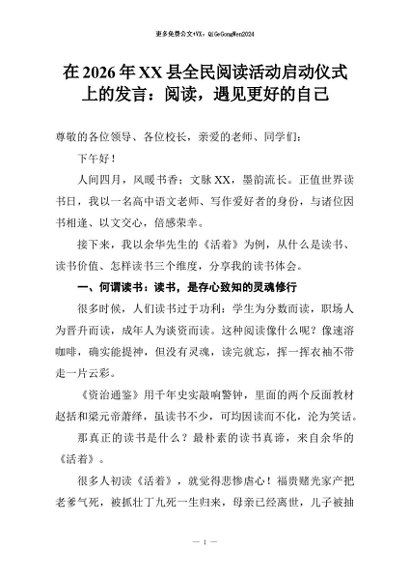 【七哥公文】2026年:在2026年XX县全民阅读活动启动仪式上的发言:阅读,遇见更好的自己+更多免费公文+VX:QiGeGongWen2024