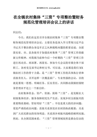 【七哥公文】2026年:在全镇农村集体“三资”专项整治暨财务规范化管理培训会议上的讲话+更多免费公文+VX:QiGeGongWen2024