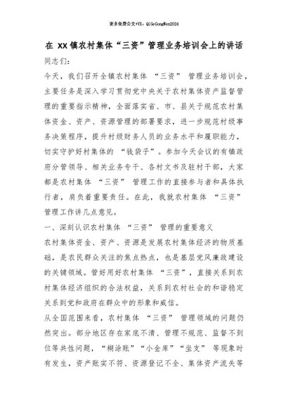 【七哥公文】2026年:在 XX 镇农村集体“三资”管理业务培训会上的讲话_副本+更多免费公文+VX:QiGeGongWen2024