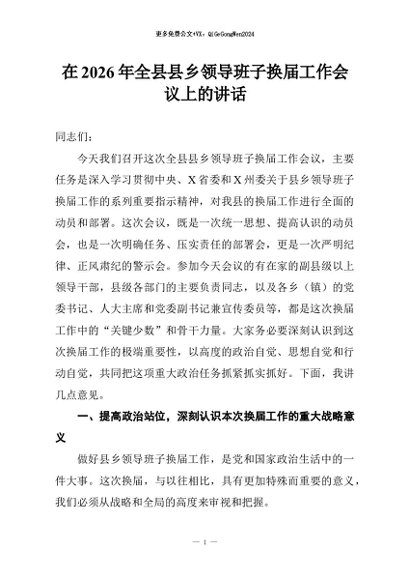【七哥公文】2026年:在2026年全县县乡领导班子换届工作会议上的讲话+更多免费公文+VX:QiGeGongWen2024