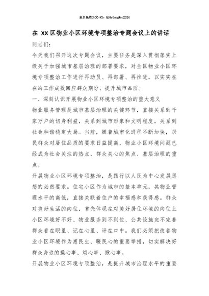 【七哥公文】2026年:在 XX 区物业小区环境专项整治专题会议上的讲话_副本+更多免费公文+VX:QiGeGongWen2024