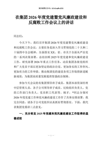 【七哥公文】2026年:公司2026年度党建暨党风廉政建设和反腐败工作会议上的讲话+更多免费公文+VX:QiGeGongWen2024