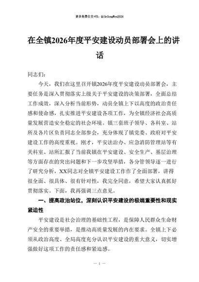 / 【七哥公文】2026年:在全镇2026年度平安建设动员部署会上的讲话+更多免费公文+VX:QiGeGongWen2024
