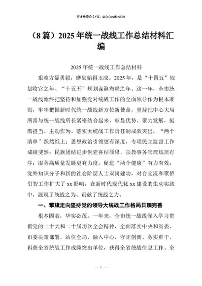 / 【七哥公文】2026年:(8篇)2025年统一战线工作总结材料汇编+更多免费公文+VX:QiGeGongWen2024