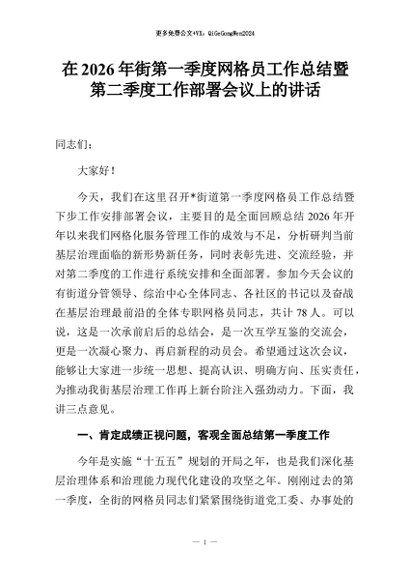 【七哥公文】2026年:在2026年街道第一季度网格员工作总结暨第二季度工作部署会议上的讲话+更多免费公文+VX:QiGeGongWen2024