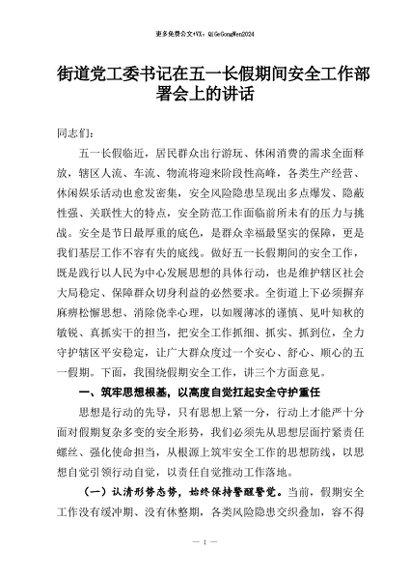 【七哥公文】2026年:街道党工委书记在五一长假期间安全工作部署会上的讲话+更多免费公文+VX:QiGeGongWen2024