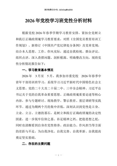 / 【七哥公文】2026年:2026年党校学习班党性分析材料+更多免费公文+VX:QiGeGongWen2024