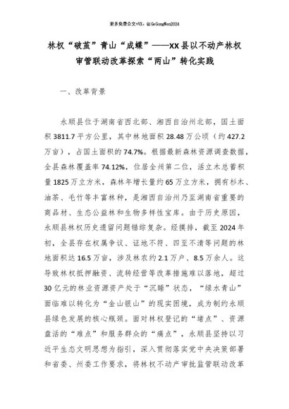 【七哥公文】2026年:林权“破茧”青山“成蝶”——XX县以不动产林权审管联动改革探索“两山”转化实践_副本+更多免费公文+VX:QiGeGongWen2024
