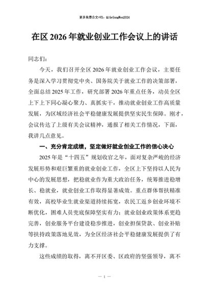 / 【七哥公文】2026年:在区2026年就业创业工作会议上的讲话+更多免费公文+VX:QiGeGongWen2024
