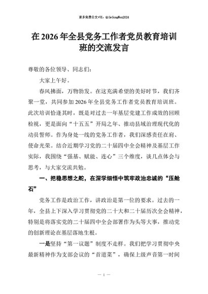 【七哥公文】2026年:在2026年全县党务工作者党员教育培训班的交流发言+更多免费公文+VX:QiGeGongWen2024
