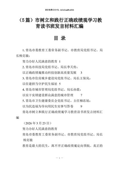 【七哥公文】2026年:(5篇)市树立和践行正确政绩观学习教育读书班发言材料汇编+更多免费公文+VX:QiGeGongWen2024