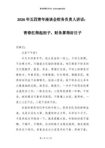 【七哥公文】2026年:2026年五四青年座谈会财务负责人讲话:青春扛得起担子,财务算得好日子+更多免费公文+VX:QiGeGongWen2024