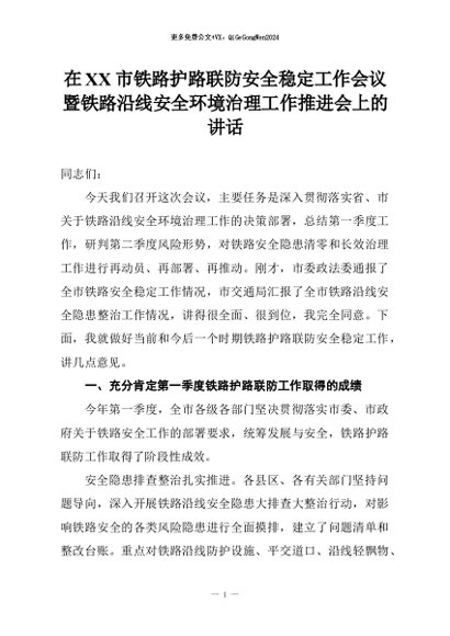【七哥公文】2026年:在XX市铁路护路联防安全稳定工作会议暨铁路沿线安全环境治理工作推进会上的讲话+更多免费公文+VX:QiGeGongWen2024