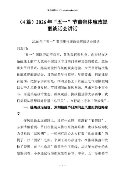 【七哥公文】2026年:(4篇)2026年“五一”节前集体廉政提醒谈话会讲话+更多免费公文+VX:QiGeGongWen2024