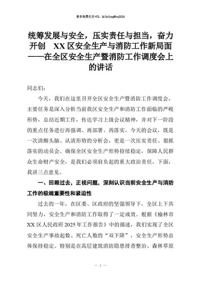【七哥公文】2026年:统筹发展与安全,压实责任与担当,奋力开创 XX区安全生产与消防工作新局面——在全区安全生产暨消防工作调度会上的讲话+更多免费公文+VX:QiGeGongWen2024