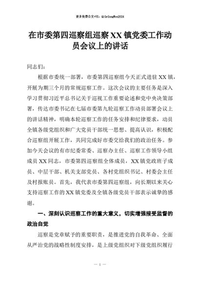【七哥公文】2026年:在市委第四巡察组巡察XX镇党委工作动员会议上的讲话+更多免费公文+VX:QiGeGongWen2024