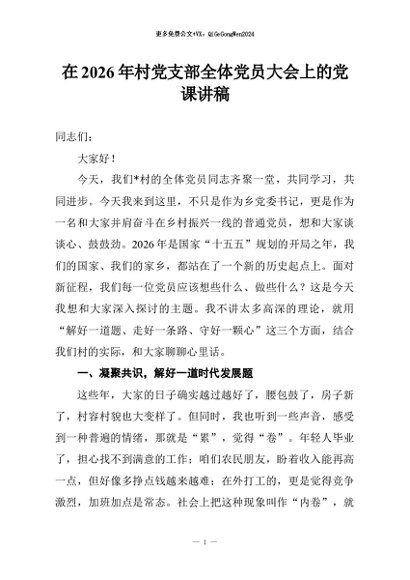 / 【七哥公文】2026年:在2026年村党支部全体党员大会上的党课讲稿+更多免费公文+VX:QiGeGongWen2024