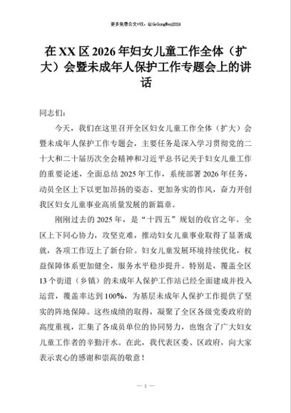 【七哥公文】2026年:在XX区2026年妇女儿童工作全体(扩大)会暨未成年人保护工作专题会上的讲话+更多免费公文+VX:QiGeGongWen2024