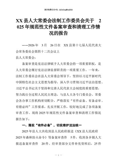 【七哥公文】2026年:XX县人大常委会法制工作委员会关于 2025年规范性文件备案审查和清理工作情况的报告+更多免费公文+VX:QiGeGongWen2024