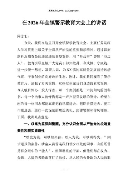 / 【七哥公文】2026年:在2026年全镇警示教育大会上的讲话+更多免费公文+VX:QiGeGongWen2024