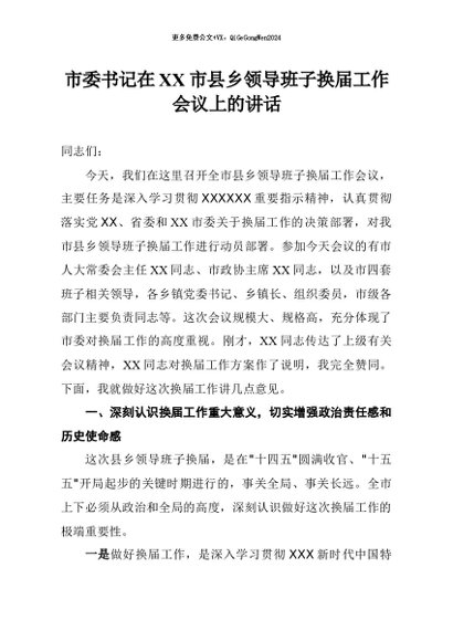 / 【七哥公文】2026年:市委书记在市县乡领导班子换届工作会议上的讲话+更多免费公文+VX:QiGeGongWen2024
