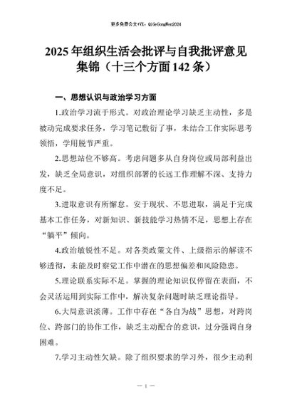 【七哥公文】2026年:2025年组织生活会批评与自我批评意见集锦(十三个方面142条)+更多免费公文+VX:QiGeGongWen2024
