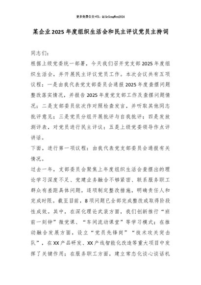 【七哥公文】2026年:某企业2025年度组织生活会和民主评议党员主持词_副本+更多免费公文+VX:QiGeGongWen2024