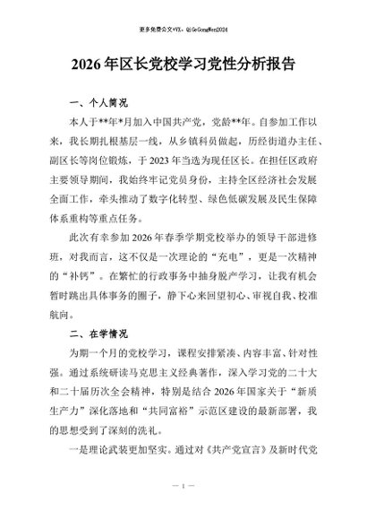 / 【七哥公文】2026年:2026年区长党校学习党性分析报告+更多免费公文+VX:QiGeGongWen2024