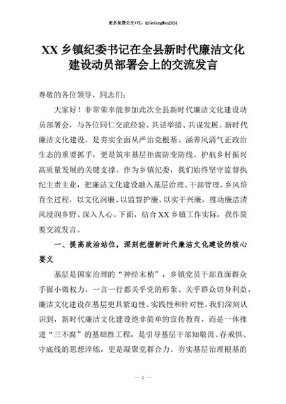 【七哥公文】2026年:XX乡镇纪委书记在全县新时代廉洁文化建设动员部署会上的交流发言+更多免费公文+VX:QiGeGongWen2024