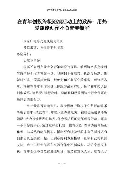 【七哥公文】2026年:在青年创投终极路演活动上的致辞:用热爱赋能创作不负青春韶华+更多免费公文+VX:QiGeGongWen2024
