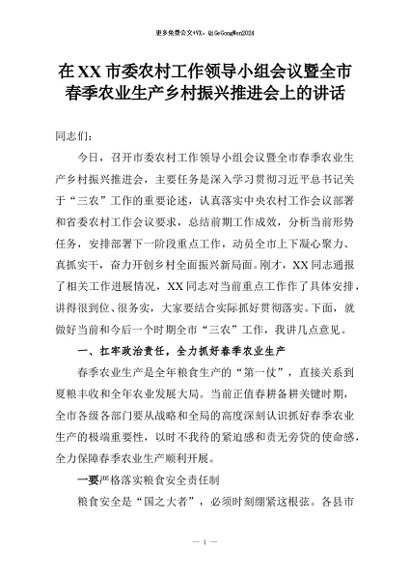 【七哥公文】2026年:在XX市委农村工作领导小组会议暨全市春季农业生产乡村振兴推进会上的讲话+更多免费公文+VX:QiGeGongWen2024