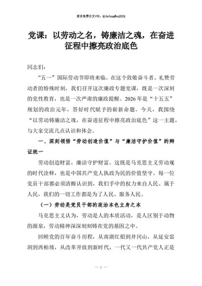 【七哥公文】2026年:党课:以劳动之名,铸廉洁之魂,在奋进征程中擦亮政治底色+更多免费公文+VX:QiGeGongWen2024