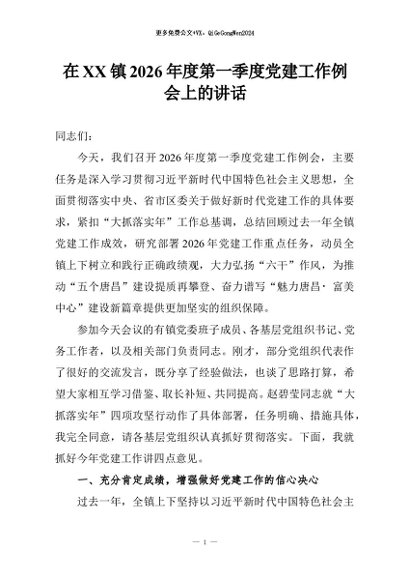 / 【七哥公文】2026年:在XX镇2026年度第一季度党建工作例会上的讲话+更多免费公文+VX:QiGeGongWen2024
