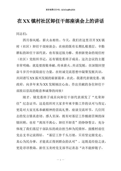 / 【七哥公文】2026年:在XX镇村社区卸任干部座谈会上的讲话+更多免费公文+VX:QiGeGongWen2024