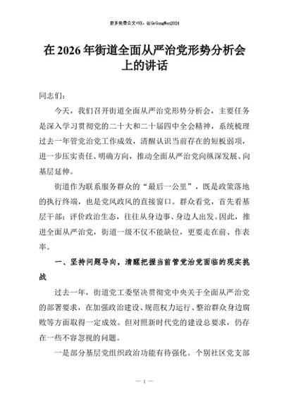 / 【七哥公文】2026年:在2026年街道全面从严治党形势分析会上的讲话+更多免费公文+VX:QiGeGongWen2024