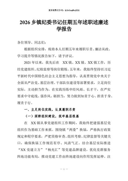 【七哥公文】2026年:2026乡镇纪委书记任期五年述职述廉述学报告+更多免费公文+VX:QiGeGongWen2024