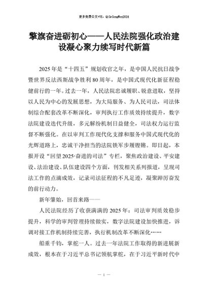 【七哥公文】2026年:擎旗奋进砺初心——人民法院强化政治建设凝心聚力续写时代新篇+更多免费公文+VX:QiGeGongWen2024