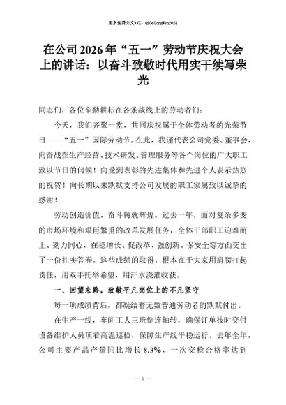 【七哥公文】2026年:在公司2026年“五一”劳动节庆祝大会上的讲话:以奋斗致敬时代用实干续写荣光+更多免费公文+VX:QiGeGongWen2024