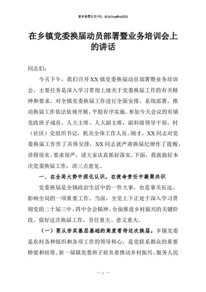 / 【七哥公文】2026年:在乡镇党委换届动员部署暨业务培训会上的讲话+更多免费公文+VX:QiGeGongWen2024
