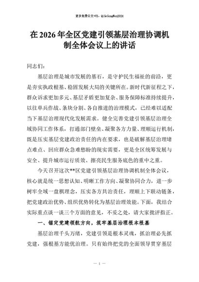 【七哥公文】2026年:在2026年全区党建引领基层治理协调机制全体会议上的讲话+更多免费公文+VX:QiGeGongWen2024